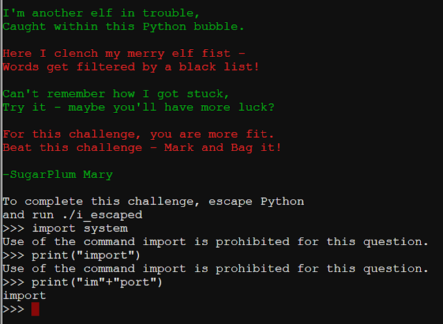 Playing around with the possibilities, we see that while print("import") would trigger the block on the word 'import', we can get around it the block with print("im" + "port") as shown above.
