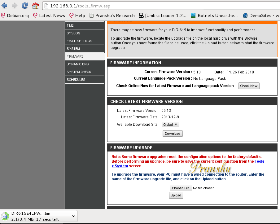 I downloaded the upgrade on my machine ("DIR********.bin")